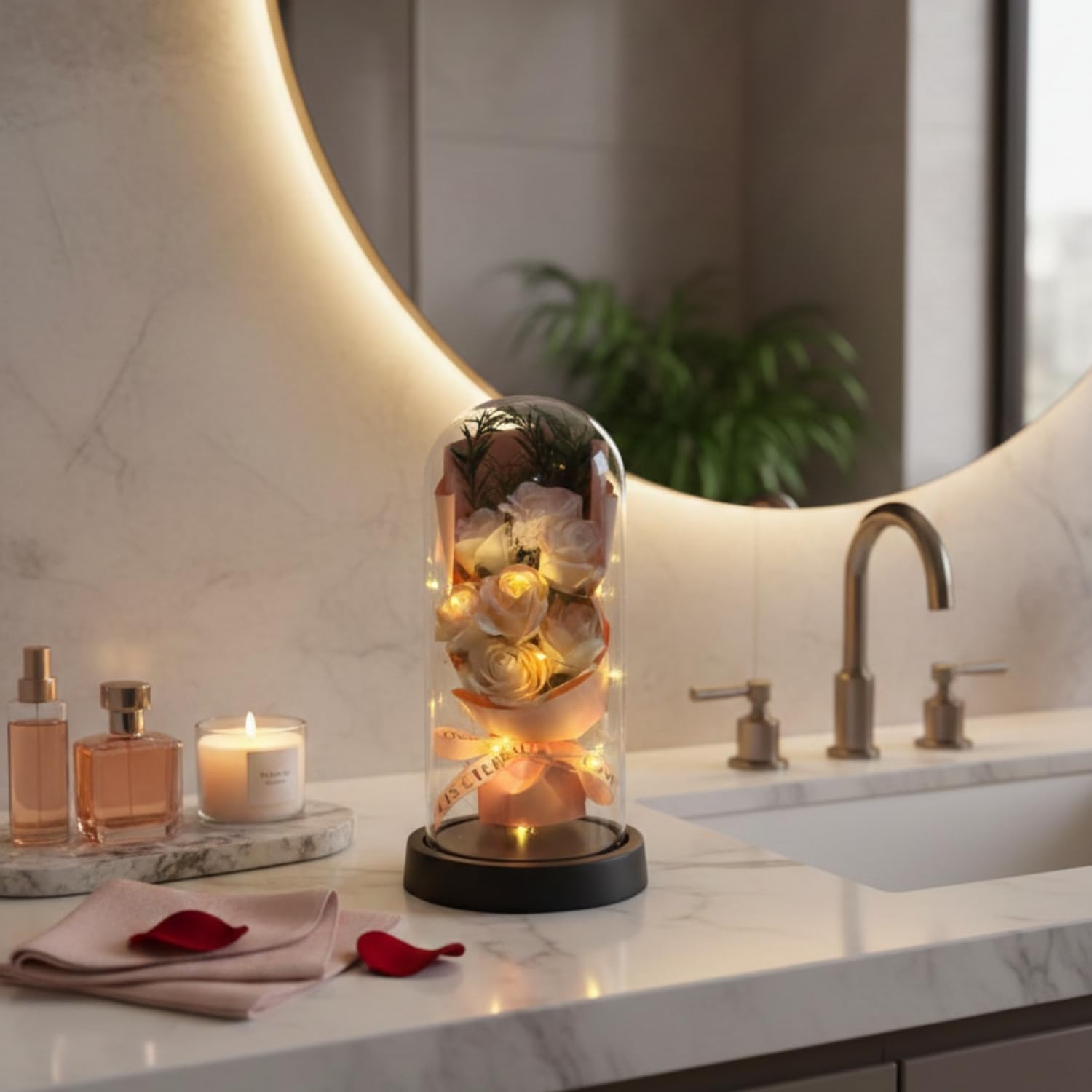 - ��MILD LED LIGHT: LED light is embedded in petals surrounding middle three roses. Need 3 AAA batteries (not included). Turn on the switch on the base, warm light will come out, creating a comfortable atmosphere and enchanting to voice for true feeling. Also, it is suitable for decoration of a room, wedding, or other occasions.